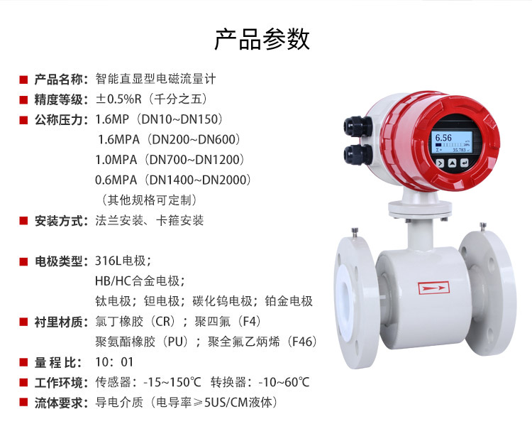 FMC-240 旗舰款 电磁流量计是根据法拉第电磁感应定律进行流量测试的流量计。电磁流量计的优点是压损极小,可测流量范围大。最大流量与最小流量的比值一般为10:1以上,适用的工业管径范围宽,最大可达3m,输出信号和被测流量呈线性,精确度较高,可测量电导率≥50μs/cm的酸、碱盐溶液、水、污水、腐蚀性液体以及泥浆、矿浆、纸浆等流体流量。